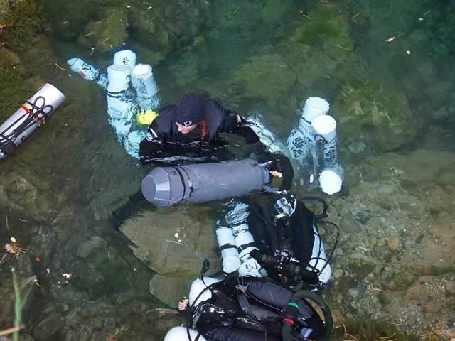 Zuvor checkten wir noch kurz die Heizhemden bzgl. Funktionalität, pluggten die Stages mit dem Trimix 35/35 in den Switchblock des RBs und atmeten die Scrubber einige Minuten an. Robin verwendete zum abtauchen neben dem an den Bailouttanks mit Straps fixierten 14 cf Argontank eine zusätzliche 14 cf Argonstage, die mit einem Boltsnap an den linken Brust-D-Ring angeklippt war. Bei dem bekannten Höhlenprofil ist ein Out of Argon keine Option.