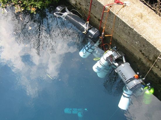 Wir fuhren dann an die Fontaine St.George und planten einen TG mit 2 Nitroxstages. Etwa bei 650 m war dann der Umkehrdruck auf der ersten Stage erreicht und wir tauchten entspannt zurück. Nach etwa 80 min waren wir wieder aus dem Wasser. Die Sicht war eher mittelmäßig bei 5-6 m und auf dem Rückweg verschlechterte diese sich nochmals durch die Perlokation auf etwa 4 m.