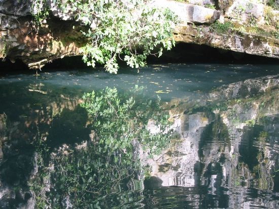 Nachdem wir noch ein bisschen mit Rick geplaudert hatten zogen wir uns um und tauchten schließlich ab, wir scooterten mit dem 50/25 in die Höhle und droppten nacheinander die Dekogase an die Leine und wechselten kurz vor dem Schacht auf die erste Trimixstage. Leider gibt es auf 36 m keine entsprechende Stelle an der man das 35/35 sicher ablegen kann, so dass wir die Stage am Boden des Schachtes auf 42 m ablegen, auf dem Rückweg macht man dann den Gaswechsel eben