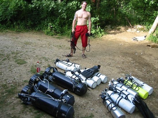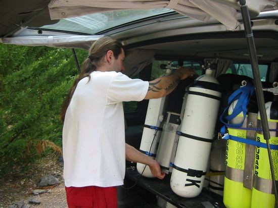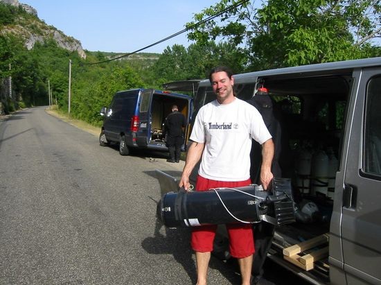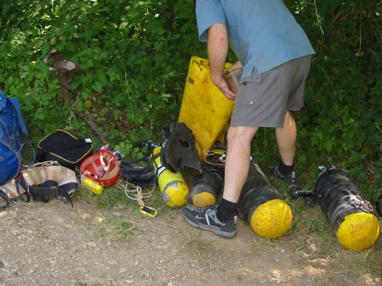 Es herrschte reger Betrieb. Rick Stanton war mit seinen Mannen an der Höhle. Er selber Tauchte mal eben kurz in die Biwakhalle, ein paar tauchten solo und andere aus seinem Dunstkreis gingen ihm an Land zur Hand. Es war schon cool, wie er mit seinem etwa 2,50 m langen Aquazepp von Olivier Isler und seinem Sidemount RB die Cele entlang tuckerte Es hatte bestimmt gut 38 Grad im Schatten und wir trödelten schon sehr und bauten in Ruhe unser Equipment zusammen.