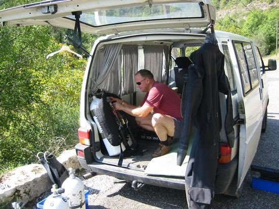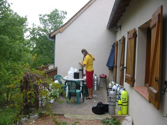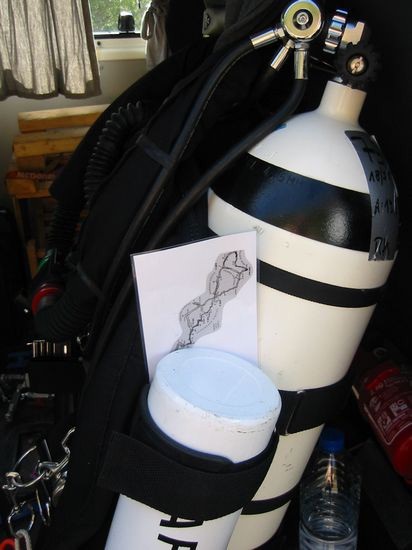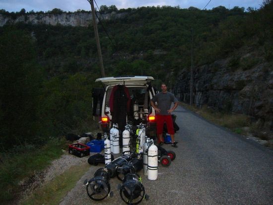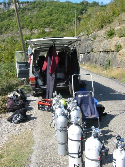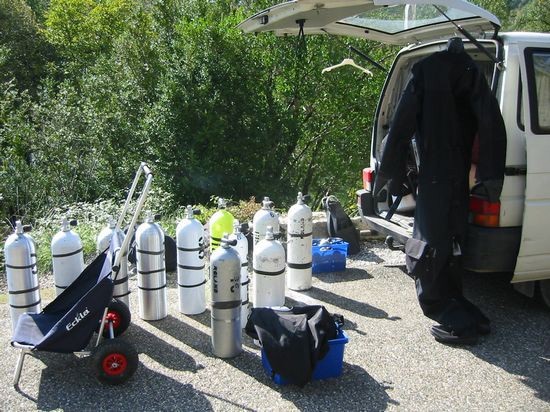 Wir machten an diesen Wochenende noch den frustranen Versuch in der St. Sauveur zu tauchen, wir hatten ja noch einige Stages mit entsprechenden MOD´s und einen Satz Dekogase, das wir einer geordneten Entsorgung zuführen wollen. Nachdem wir uns komplett angezogen hatten und das ganze Zeug im Pool war checkten wir die Sicht. Die Sicht war okay, aber der Flow an der Eingangsrestriktion war so heftig, das die Kiessteinchen herumflogen. No Chance, also das ganze Manöver abgebrochen und die 11 Stages und die 4 Scooter wieder ins Auto und ab nachhause. Sehr schade.