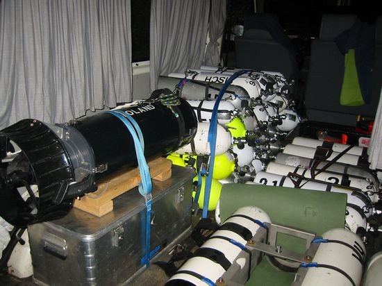 Wir planten erneut wie folgt: Roland auf dem RB 80 mit D20 und einer Trimixstage 17/55 nebst 3 Dekogasen und Robin OC mit D18 mit 4 Trimixstages 17/55 und ebenso 3 Dekogasen (Oxygen, 50/25, 35/35). Wir verwendeten 4 Standard Gavins, 2 Scooter wurden von uns als Backupscooter mitgeführt.