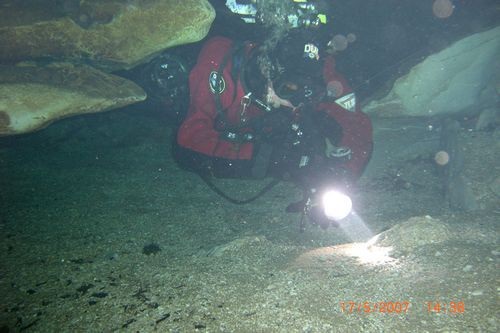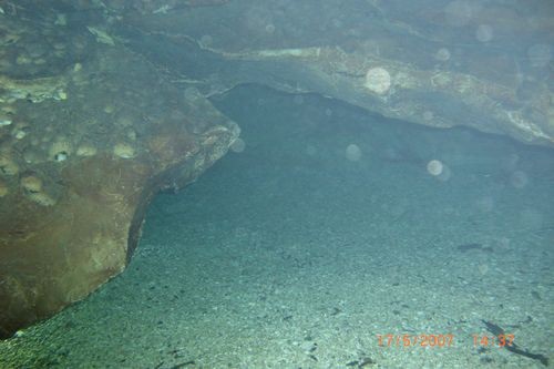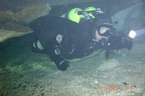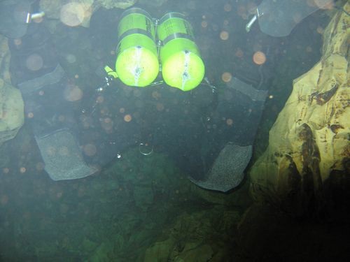 unerheblich nach, so dass wir uns ein bisschen frei graben mussten. Hier machte das mit der von uns mitgeführten Ausrüstung keinen Sinn, bei 95 m Tiefe war die Höhle zu Ende, außerdem war die Spool vollständig abgewickelt. Wir befestigten die Spool, hinterließen einen Cookie und traten den Rückzug an. Auf dem Rückweg gingen wir es gemütlich an, genossen noch einmal das ständig wechselnde Gesicht dieser sehr schönen Höhle. Nach 15 min O2 Deko im Pool war tauchten wir nach 175 min schließlich auf.