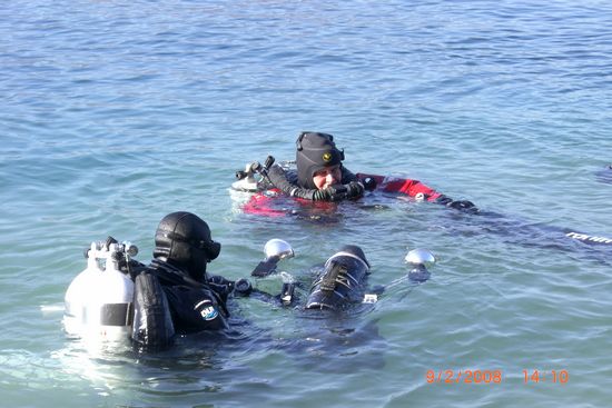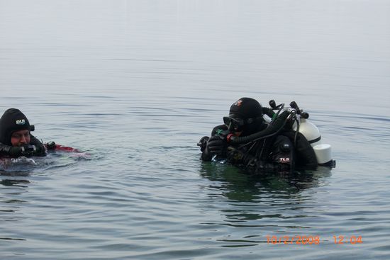 Robin, Arne und Marc waren mit den Rebreathern unterwegs. Oli und Tim OC und machten einen Trimix TG an der Steilwand auf 90 m mit 15 min Bottomtime, eine längere Grundzeit war bei durchgehend 3 °C im Wasser nicht drin. Clemens und Holger tauchten auf 75m. Alle waren mit Gavin bzw. Suexscootern unterwegs.