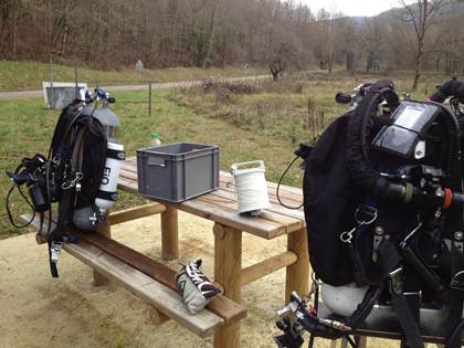 Für den heutigen Tag hatten wir einen entspannten Tauchgang in der Source de l‘Orbe geplant. Bei meinen letzten zwei Besuchen hatte mir diese schöne Höhle leider den Zutritt verweigert. Wir nahmen jeweils eine D12 EAN 32 sowie das restliche 21-Meter-Gas vom Vortag mit. Die Stages legten wir auf 21 m im „Schacht“ ab. Kurz vor Ende der Mainline legte Chris noch einen Jump und wir tauchten im See auf. Wir schauten uns in Ruhe um und traten dann den Rückweg an. Nach einer ges. Tauchzeit von 71 min. und einer max. Tiefe von 26 m, war das Vergnügen auch schon wieder vorbei : (