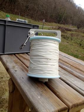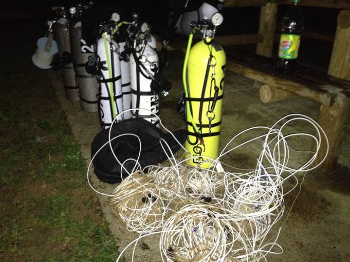 Nach einer kurzen Stärkung ging es dann endlich los, wir tauchten ein paar Meter im Fluss bis zum Höhleneingang. Auf 6 Metern klippten wir den Sauerstoff in die Caveline und tauchten zügig weiter. Die Sichtbedingungen waren nicht so gut wie erhofft. Auf 21 Metern legten wir das nächste Dekogas ab. An der zweiten engeren Passage, auf ca. 33 m, hat Chris das Reel mit der im Juli neu eingebrachten Leine verbunden und unser Projekt startete. Chris verlegte die geknotete Caveline und ich begann die bis zu fünf parallel bzw. kreuz und quer verlegten Leinen und Stahldrähte aufzuwickeln. Der Draht an sich war eine unschöne Sache und machte das Unterfangen nicht leichter. Die Höhle fällt relativ steil bis auf ca. 42 m ab und erreicht den tiefsten Punkt bei ca. 55 m. Die Sicht verschlechterte sich wie erwartet während des Aufräumens zunehmend auf teilweise unter einen Meter. Dies machte die Arbeit etwas unangenehmer, jedoch waren wir gut organisiert und entfernten uns nur so weit wie nötig von einander. Das Aufräumen war sehr sehr langwierig und wir entschieden uns die Zeit bis zum Umdrehen zu verlängern (die Durchschnittstiefe war flacher als angenommen).
