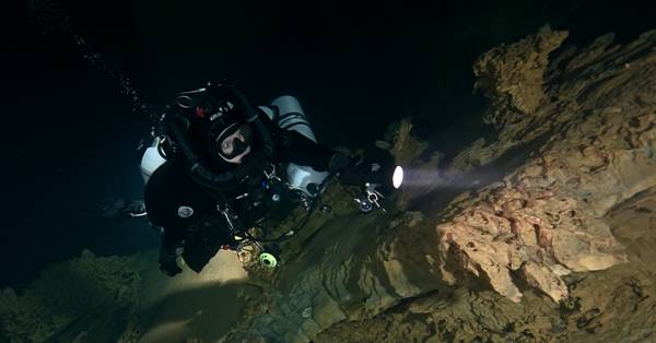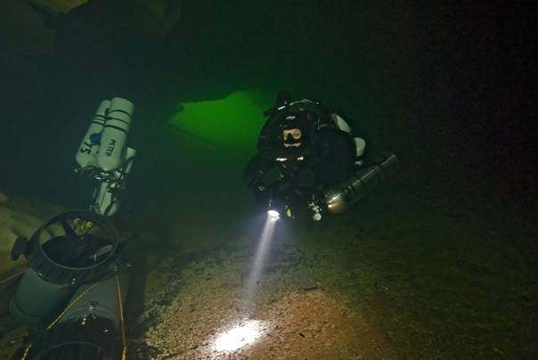 Für den nächsten Tag (Mittwoch) stand erst mal die Cabouy auf dem Plan. Wir wollten gern die Vermessungen, die wir beim Cavebaseprojekt im März begonnen hatten, fortführen. Das hieß scootern bis zur Abzweigung Pou Meyssen, dort die Scooter ablegen und zu Fuß weiter zum Vermessen. Bewaffnet mit Maßband, Kompass, Schreibtafel und genügend gespitzten Stiften für die Vermessungsarbeiten, sowie Fotokamera für die Dokumentation begaben wir uns ins Wasser. Die Sicht betrug im vorderen Teil nur 3 – 4m, keine guten Startbedingungen für Vermessungen. Aber auf Grund der bisherigen Erfahrungen, dass im hinteren Bereich jenseits der Pou Meyssen die Sicht deutlich besser wird, setzten wir den Tauchgang fort. Wir wurden eines besseren belehrt, die Sicht trübte hinter der Abzweigung zur Pou Meyssen ein auf 1 – 2m. Nach 15 Minuten flösseln drehten wir um, schwammen zurück zu den Scootern und tuckerten zum Ausgang. An Fotos war bei der schlechten Sicht leider auch nicht zu denken.