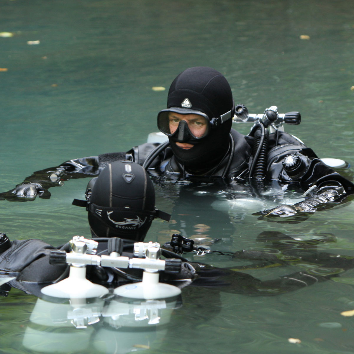 Dieser Moment ist der aufregendste von allen. Man steht im Wasser mit einem wahnsinnig schweren Tauchgepäck auf dem Rücken, kann sich über Wasser kaum noch bewegen und ist im Begriff so tief in eine Höhle abzutauchen, dass viele einen solchen Tauchgang als lebensmüde bezeichnen würden. Das Risiko ist tatsächlich nicht zu unterschätzen, aber Vorbereitung, Professionalität, Teamgeist, Buddy Awareness und viel Erfahrung geben schlussendlich die notwendige Sicherheit um doch abtauchen zu können.