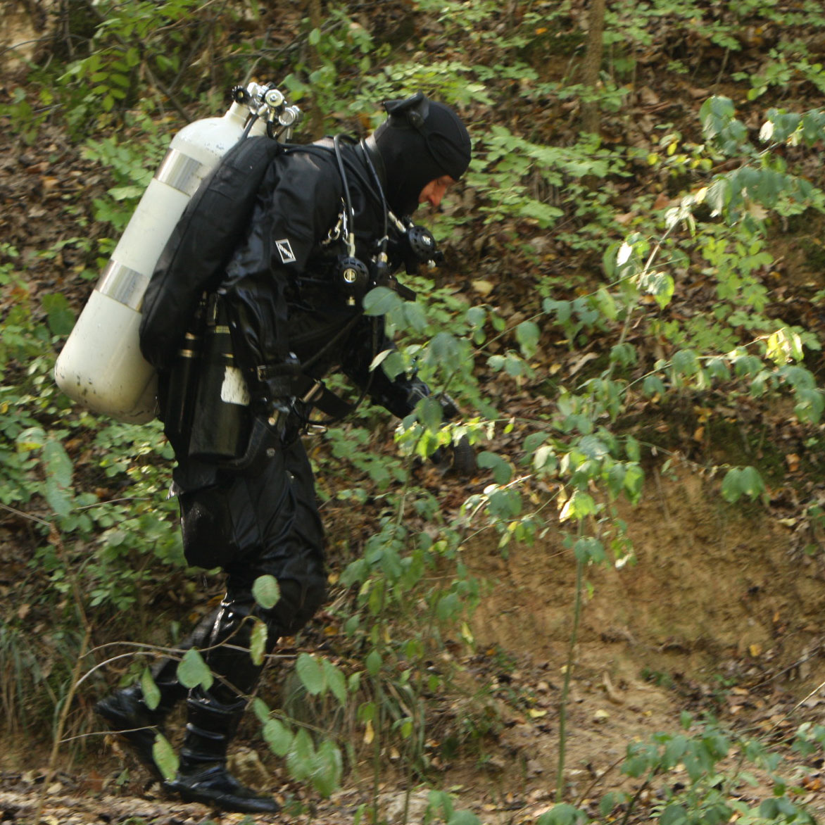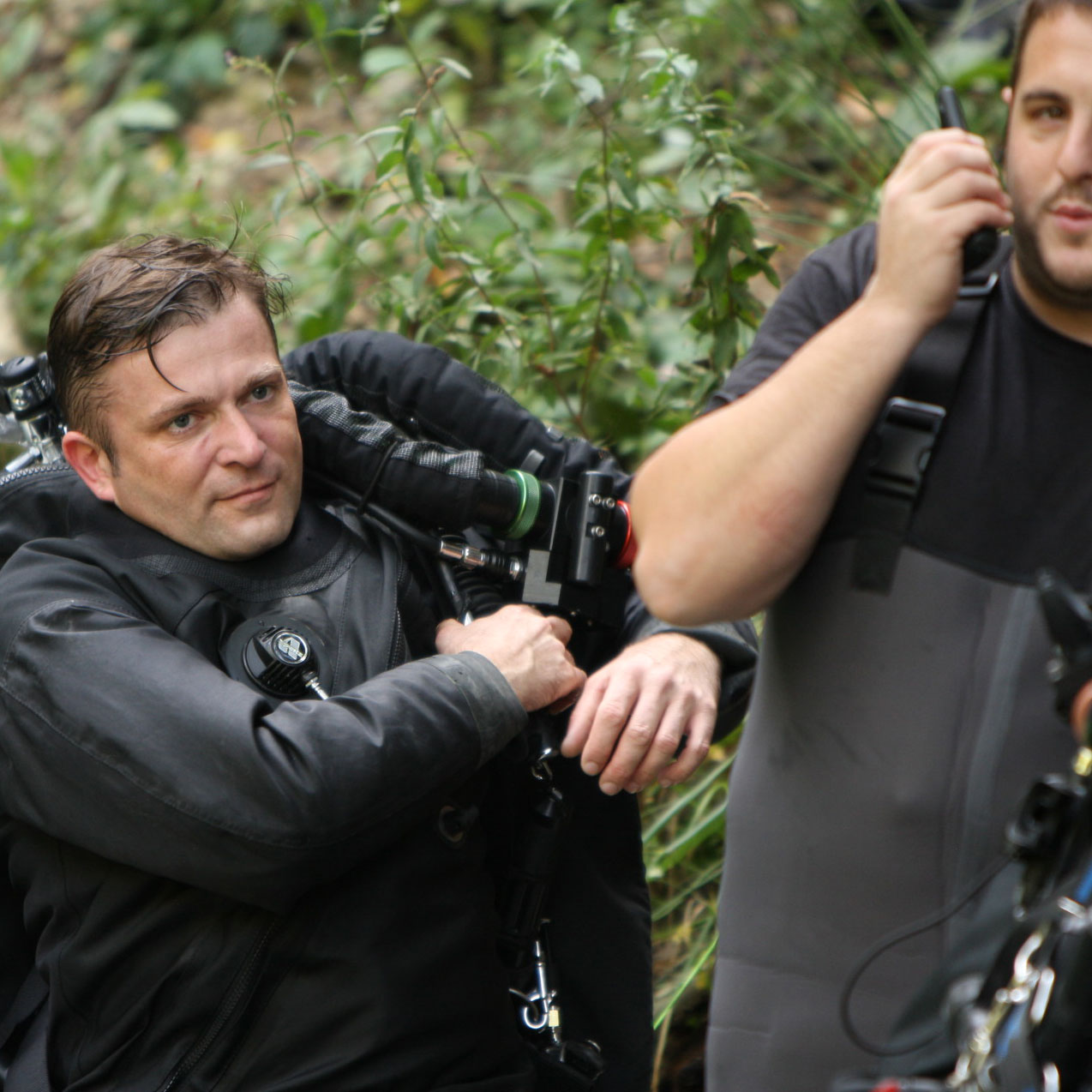 Der Rebreather wiegt fast 100kg und beim Hineinschlüpfen ächzt man wie ein stark überladener Packesel; der Trockentauchanzug schränkt einen sowieso schon ein und allein das Hinabgleiten vom Rentnertisch ins Wasser bringt den Puls auf 140 Schläge pro Minute. Anstrengung und Aufregung stehlen einem fast den Atem und in unseren Gesichtern erkennt man deutlich den Stress, dem wir ausgesetzt sind. Kein Grinsen, kein lustiger Spruch – auch den anderen steht die Anspannung ins Gesicht geschrieben – wenn jetzt was schief geht ist unter Umständen die gesamte Vorarbeit umsonst. Alles wird doppelt und dreifach geprüft und jeder Handgriff erfolgt unter den prüfenden Blicken der Teammitglieder – man spürt förmlich wie ein Gedanke in allen Köpfen regelrecht pocht: „Hoffentlich klappt alles wie geplant“.