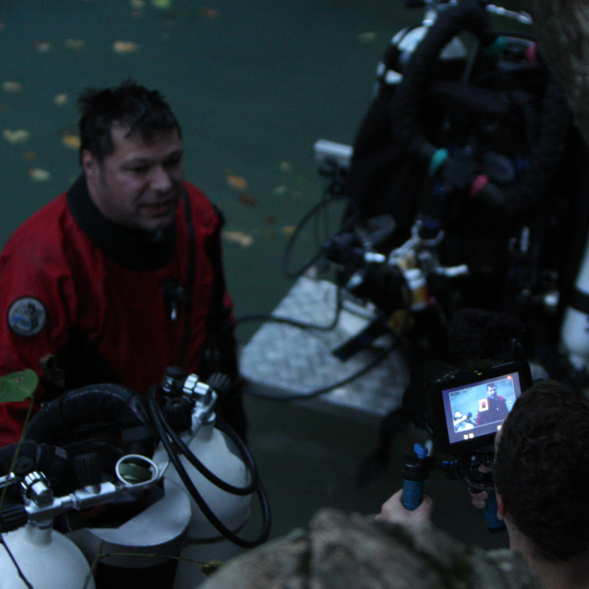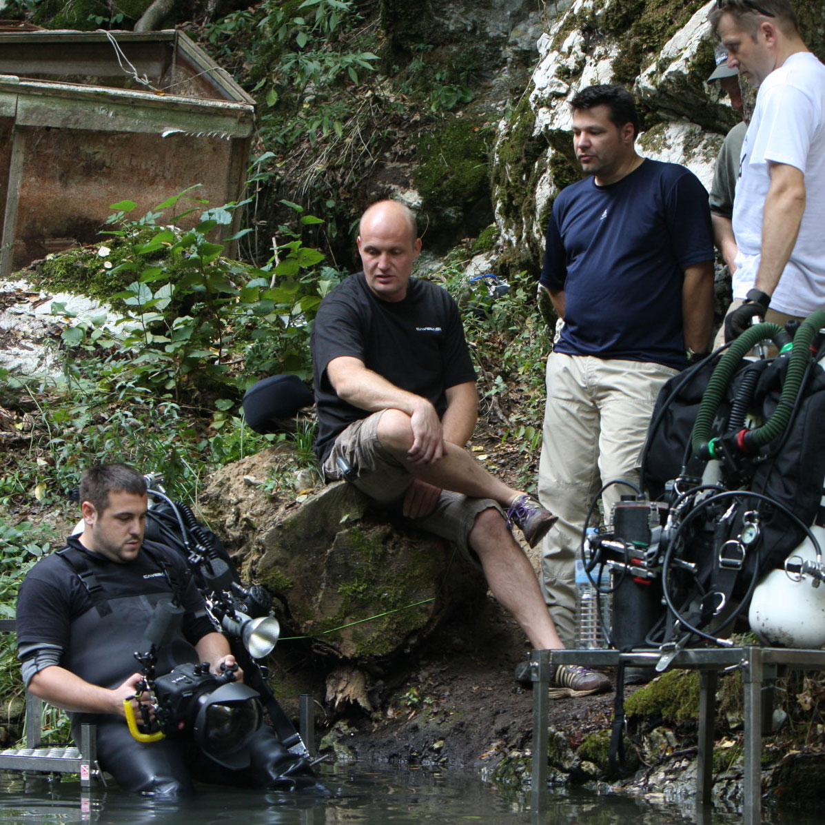 Glücklich erreichten alle wieder den Parkplatz, auf dem nun scheinbar wie bestellt der Minister eintraf. Noch in voller Tauchmontur berichteten Darko und Danny dem Minister und dem serbischen Fernsehen von ihrem Tauchgang. Auf welches Wohlwollen wir trafen, zeigt die Tatsache, dass die Cavebase der noch namenlosen Höhle nun einen Namen geben durfte. Schnell war klar, dass dieses Recht an Darko gehen musste, der durch seinen intensiven, aufopferungsvollen Einsatz uns dieses Projekt erst ermöglicht hatte. Es war ein bewegender Moment als Darko sich entschied die Höhle nach seinem Sohn zu benennen. Wir können also stolz berichten, dass die Cavebase die „Adrian“ Höhle nicht nur zum ersten mal betaucht hat, sondern ihr auch einen Namen geben durfte.