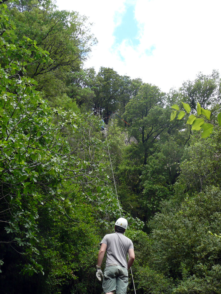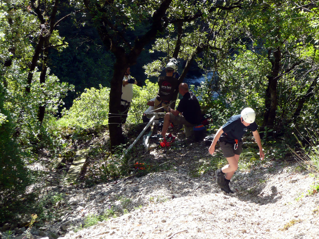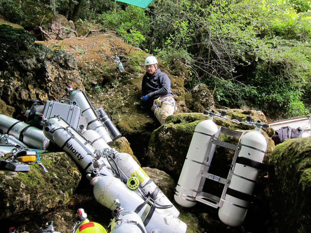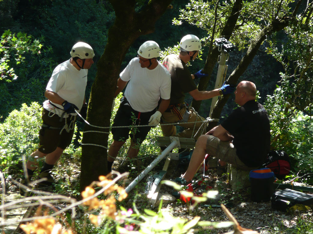 Neben den taucherischen Ansprüchen stellt die Umgebung der Gourneyrou ebenfallseine beachtliche Herausforderung dar. Das Gelände ist sehr unwegsam, der Höhlenpool liegt fast 70 Höhenmeter tiefer als der letzte begehbare Weg. Mittels Seilbahn muss jedes einzelne Ausrüstungsteil zum Höhlenpool befördert werden – und das sind gut und gerne 2Tonnen Gewicht!
