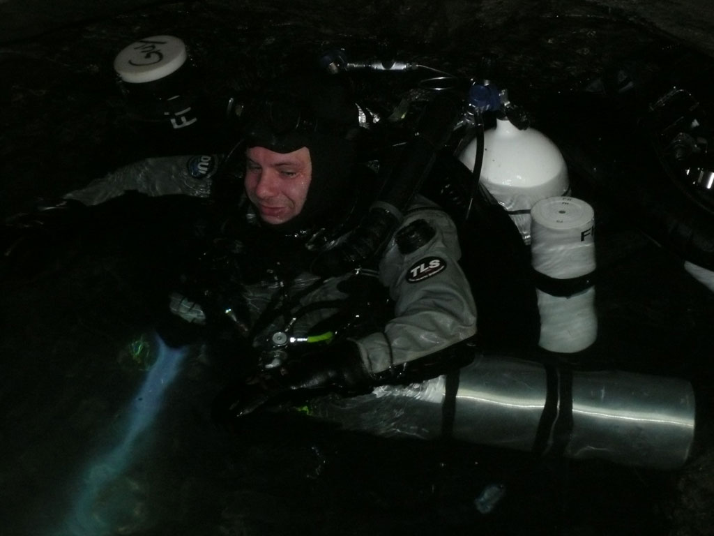 Als sie die Oberfläche durchbrachen, war es bereits finstere Nacht und zwar exakt halb eins. Alle waren total geschlaucht, Tobias und Wilke quälten sich aus dem Pool und zogen sich erst mal um – und das ist schon heftig, nach über 14h Tauchzeit waren die Beiden nicht mehr in der Lage ihre Nasstauchhandschuhe selber auszuziehen, keinerlei Kraft mehr in den Fingern und eine völlig steife Körperhaltung!
