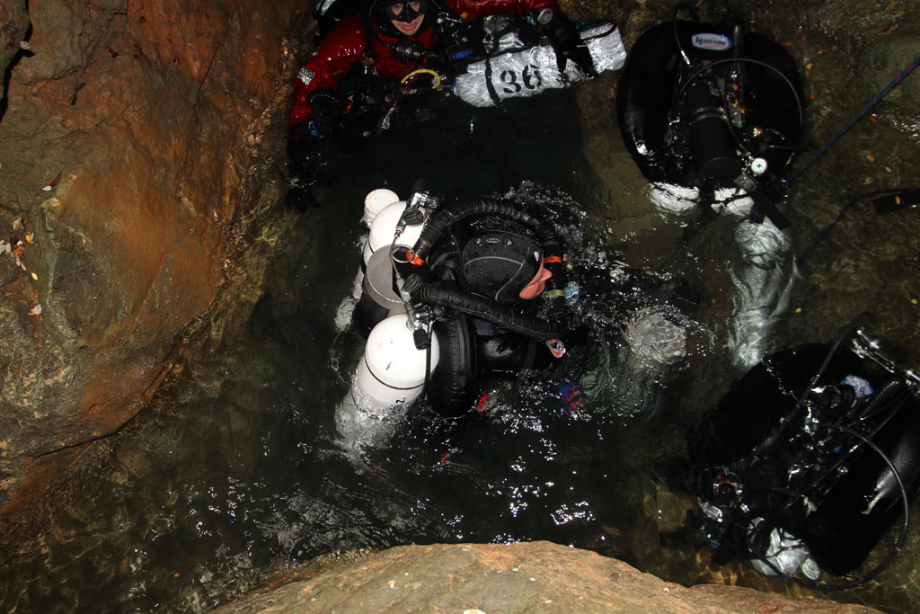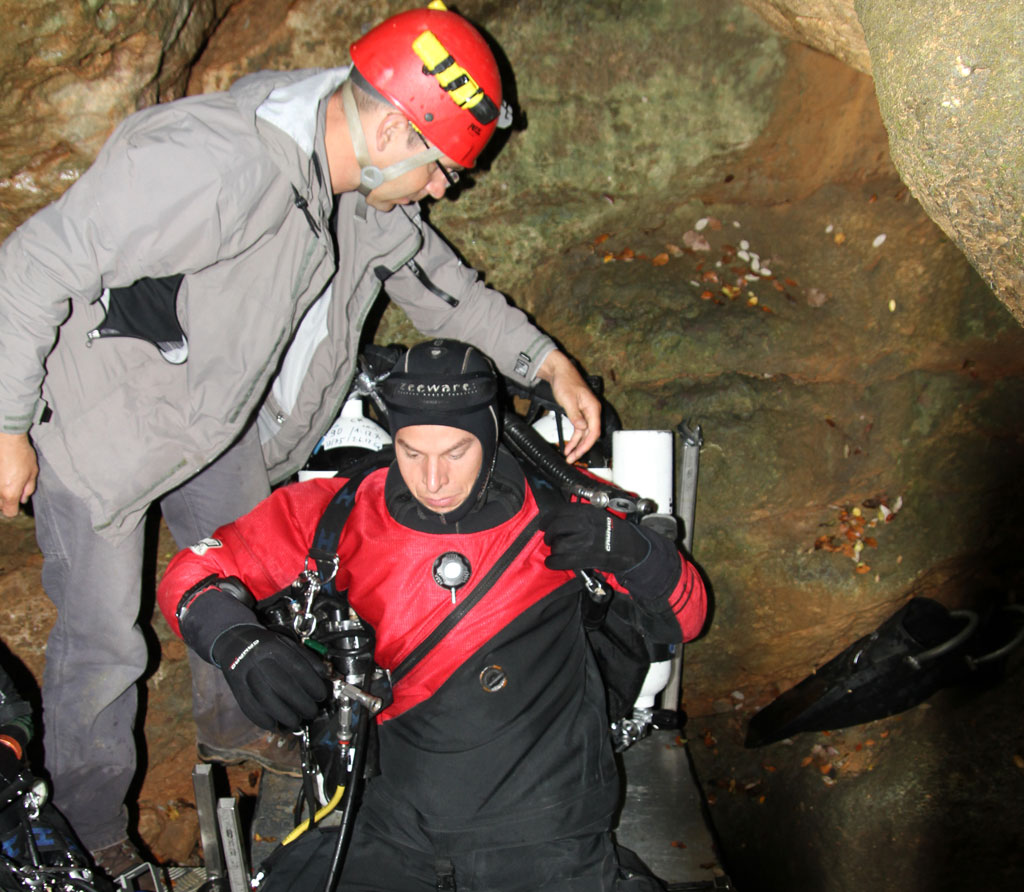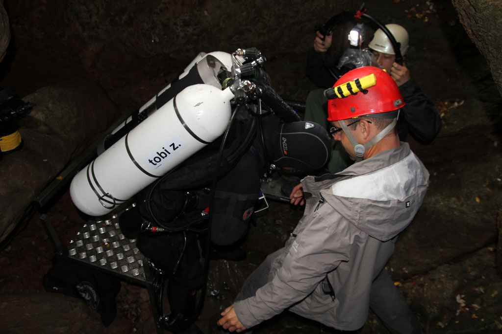 Als zum Ende der Deko, mit dem langsamen Aufstieg begonnen wurde und das Deep Setup Team nach wenigen Minuten die Oberfläche des engen Quellteichs durchstießen gaben sie die vermutete Info über die Pushdiver direkt weiter. Jetzt konnte sich die Supportcrew zum ersten Kontakt fertig machen. Darko unterstützte erst Oliver und dann Florian beim Ablegen der Geräte, damit Platz im Pool geschaffen wurde und die nächsten beiden Kollegen abtauchen konnten um die Infos zur Deko und die hoffentlich erste Erfolgsmeldung von Tobias und Wilke abzuholen. Kurz darauf gingen auch schon die ersten Support Taucher ins Wasser um nach dem Stand der Dinge des Pushtaucher Teams zu fragen und Ausrüstung mit nach oben zu bringen.