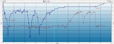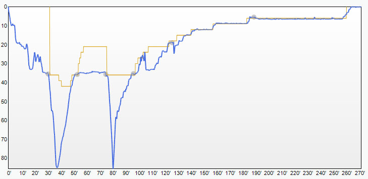 Als nächster Programmpunkt stand ein weiterer Tauchgang von Oliver und Florian auf der Tagesordnung. Dieses mal sollten die beiden den Push-Tauchern entgegentauchen um ihnen die bis dahin nicht mehr benötigte Ausrüstung abzunehmen. Der abgesprochene Rendezvous Punkt befand sich nach dem „ersten Knick“ in ca. 35m Wassertiefe. Start der beiden war so getaktet das sie sich im abgesprochenen Zeitfenster dort treffen würden. Als maximale Wartezeit am Treffpunkt waren 30 Minuten vereinbart.