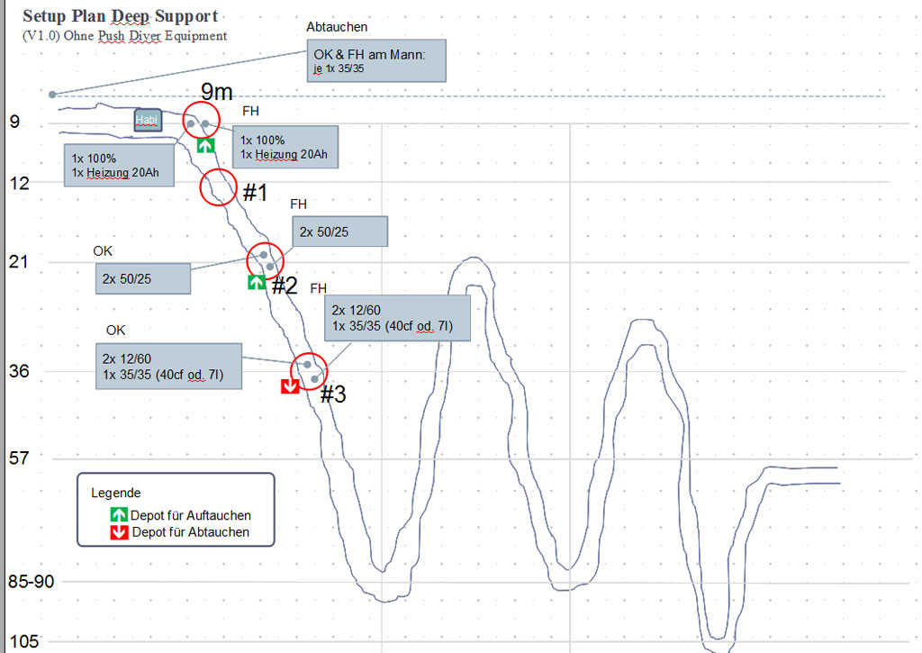 Die beiden hatten es sich zur Aufgabe gemacht das letzte noch fehlende Depot für den Push-Tauchgang anzulegen. Das Depot #5 sollte auf 57m angelegt werden um dort zum einen Reservegas in Form von 18/45 abzulegen wie auch Gase die die beiden Push-Taucher weiter in die Höhle mitnehmen würden (35/35 und 12/60) zu platzieren.