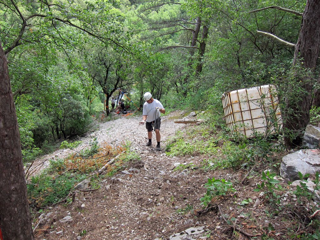Das Lager an sich war diesmal sehr schnell eingerichtet, Latrine ausheben, Sonnenplanen und Regenschutz anbringen, Feuerholz sammeln, Zelte aufbauen, Stromversorgung sicherstellen und das Einrichten der „Abwaschstelle für Geschirr“ verliefen reibungslos und gleichzeitig in Rekordzeit. Gegen 22:00 Uhr verabschiedeten sich bereits die ersten Teilnehmer. Tagesziel für den ersten Projekttag: Seilbahn aufbauen und das Equipment zum Höhlenpool befördern. Hört sich einfach an, hat es aber in sich. Die Berg-, Mittel- und Talstationen wurden mit „Personal“ besetzt und jede Station hatte die Aufgabe die Teile der Seilbahn anzubringen die für diesen Standort relevant waren. Florian, Andreas und Guy kümmerten sich um die Talstation; Benjamin, Oliver, Marc und Wilke um die Mittelstation und der Rest befand sich an der Bergstation.