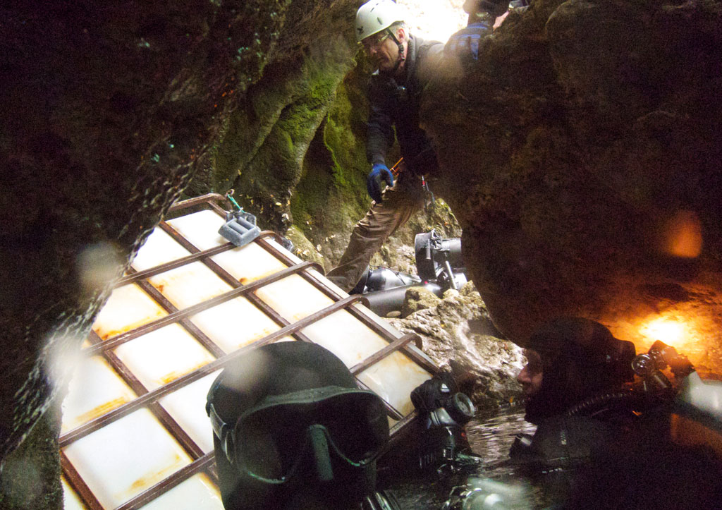 Das letzte große Ausrüstungsteil war das Habitat, nach dem Abtransport zur Talstation hatten sich mittlerweile alle Teilnehmer an der Talstation eingefunden – die Seilbahn war nun erstmal für die kommenden Tage nicht mehr von Bedeutung, alles spielte sich im Bereich der Talstation ab. Das Habitat „zuwässsern“ und in der Höhle zu platzieren war jetzt eine der wichtigsten Aufgaben. Glücklicherweise war das Habitat innerhalb weniger Minuten im Wasser – was echt ein wenig mit Glück zu tun hat, denn der Eingangsbereich der Höhle ist recht eng und das Habitat passt hier nur in einer leichten Drehbewegung durch – und wenn sich das Ding einmal verkeilt und fest steckt hat man echte Probleme es wieder loszureißen. Aber diesmal klappte es echt schnell und die ersten Tauchgänge starteten kurz darauf.