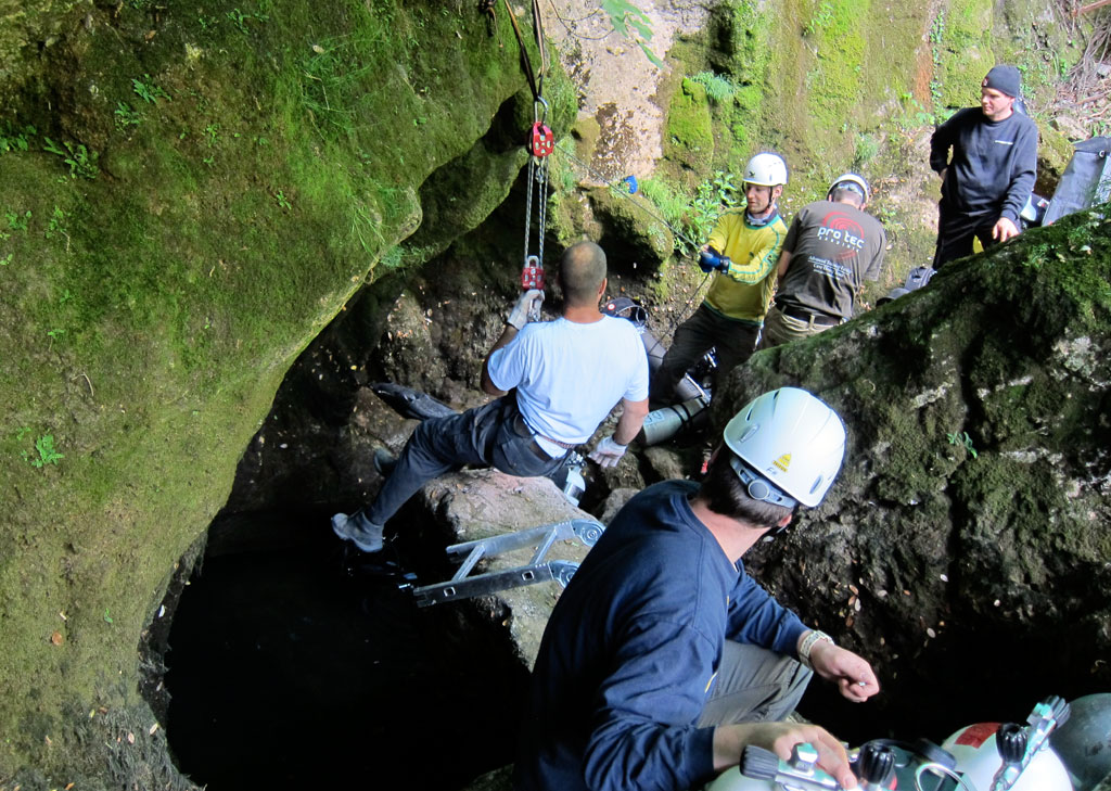 Das tatsächliche Abtauchen fand um 10:00 Uhr, also zwei Stunden später als geplant statt. Tobias und Wilke gaben noch ein kurzes OK Zeichen und tauchten dann für die nächsten 14,5h in die Gourneyrou Höhle ab.