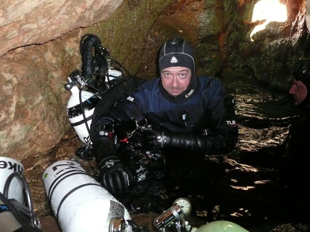 Bis 57m war der Verlauf der Höhle bekannt, leichtes auf und ab, mal ein wenig enger, mal ein wenig breiter, aber immer noch so breit, dass ein Scootern bei mäßiger Fahrt problemlos möglich war. Ab 57m fiel die Höhle rabiat ab, zwar kein „Schachtfeeling“ aber der Abstieg war durchaus deutlich und der Verlauf der Höhle wurde kurviger und enger. Die Felsen selber waren eher dunkler eingefärbt, stellenweise blitze ein wenig weißes Gestein auf.