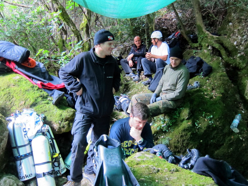 Am dritten Tag war alles benötigte Equipment in der Talstation angekommen. Florian, Andreas und Oliver hatten als Talstationsteam am Vortag bereits ganze Arbeit geleistet! Die Drei hatten das ankommende Material in dem sehr unwegsamen Gelände so geschickt aufgeteilt und organisiert, dass jeder Taucher seine eigene „Ecke“ hatte. Für das ungeschulte Auge wirkte der Höhlenpool vermutlich trotzdem wie ein „Truppenübungsplatz“, aber alles hatte seine Ordnung! Die Drei hatten sogar schon ein Sonnen- und Regenzeltdach angebracht, so dass fast der Hauch einer „Luxus-Talstation“ entstand.
