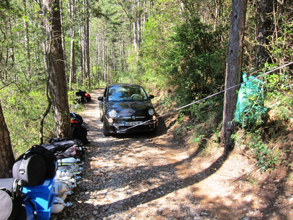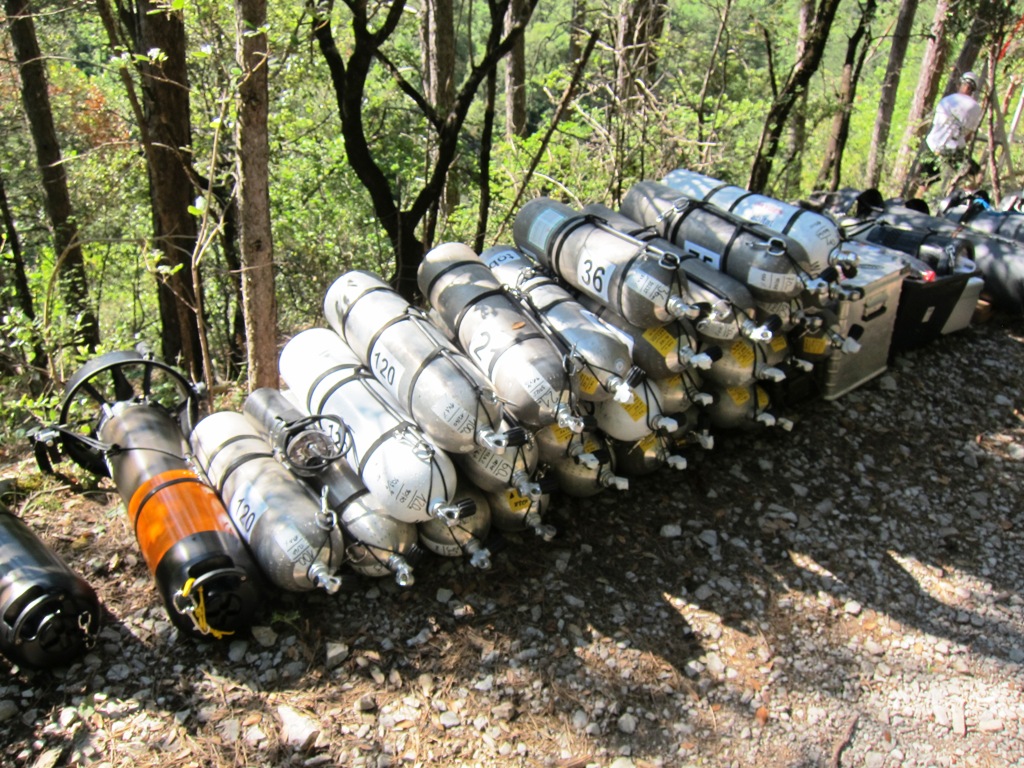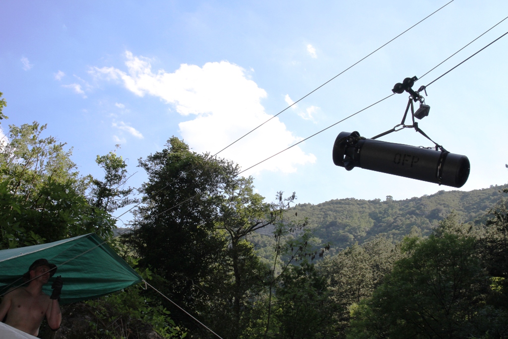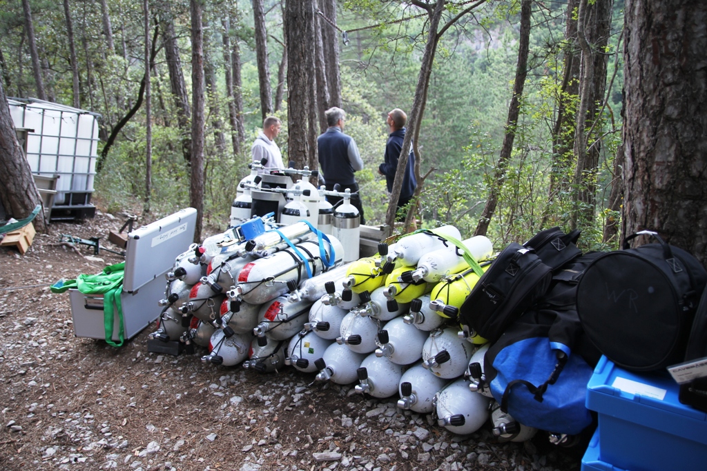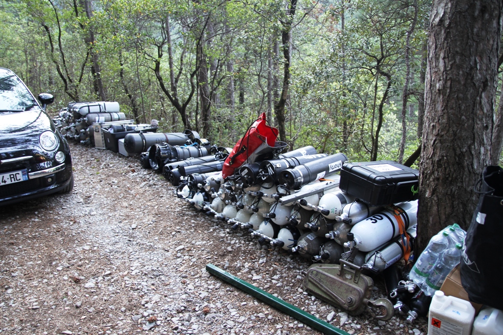 Das Hinab befördern von Material zum Höhlenpool ist an der Gourneyras in der Tat ein wenig einfacher, die Tatsache, dass das Plongée Sout Team mit Frank Vasseur eine Seilbahn angebracht hat, macht den Zugang für normales und leichtes Tauchequipment deutlich einfacher. Allerdings erschien uns die Konstruktion für unsere Doppel 20 Geräte einfach nicht stabil genug, so dass wir kurzerhand unsere eigene Seilbahnkonstruktion aufgebaut haben. Dank dem mittlerweile sehr erfahrendem und eingespielten Cavebase Team hatten wir bereits nach wenigen Stunden die Seilbahn aufgebaut und in Betrieb genommen. Nach ca. 4,5h Seilbahnbetrieb hatten wir alles nach unten befördert und nun lagen dort: 70 Stages, sieben XK1 Scooter, zwei Halcyon T-16 Scooter, ein Gavin, ein SUEX Magnum Scooter, fünf Doppel 20 Rebreather Frames, ein D12 Rebreather Frame, zwei Doppel 20 OC Geräte, sechs Doppel 12, zwei Sidemount RB80, ein Habitat, 7 Heiztanks und unzählige Taschen, Trockis, Regler, Akkutanks, Lampen und Tragetaschen; eben alles was ein Höhlentaucher für einen ca. 5h Tauchgang auf ca. 60m Durchschnittstiefe so braucht.