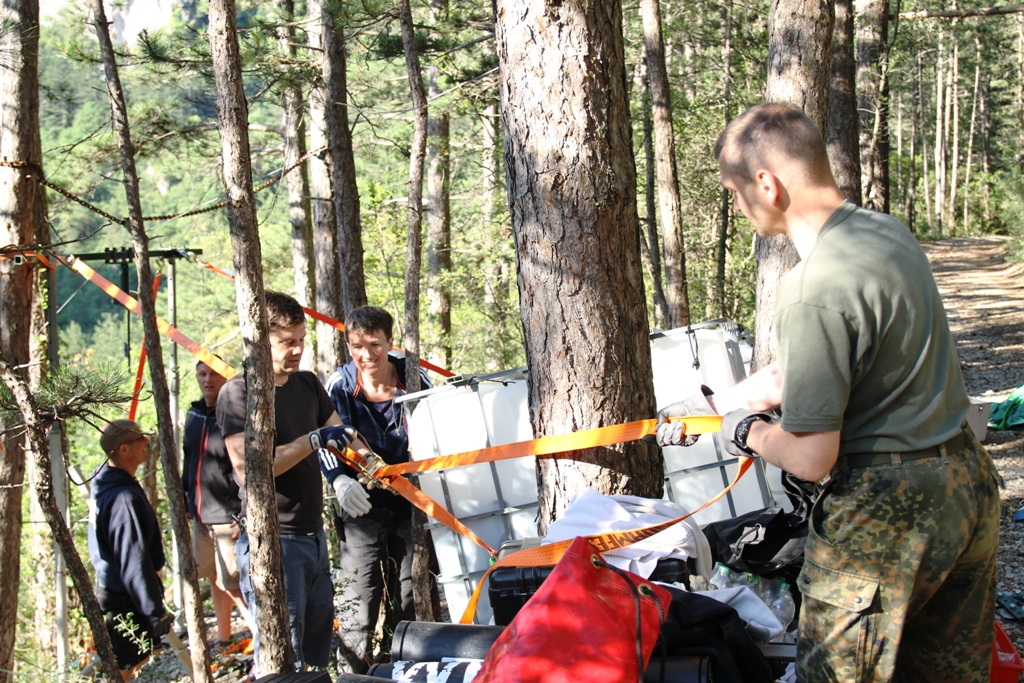 Der letzte Projekttag endete wie der erste begonnen hatte – mit viel Schlepperei. Nach den abgeschlossenen Tauchgängen mussten die gut 2.5 Tonnen Ausrüstung wieder nach oben. Das hieß alle Mann (Frau) an die Seilbahn und Schleppen. Dank der sich inzwischen aufgebauten Übung hatten wir bis Mittag aber schon alles wieder oben an der Straße.