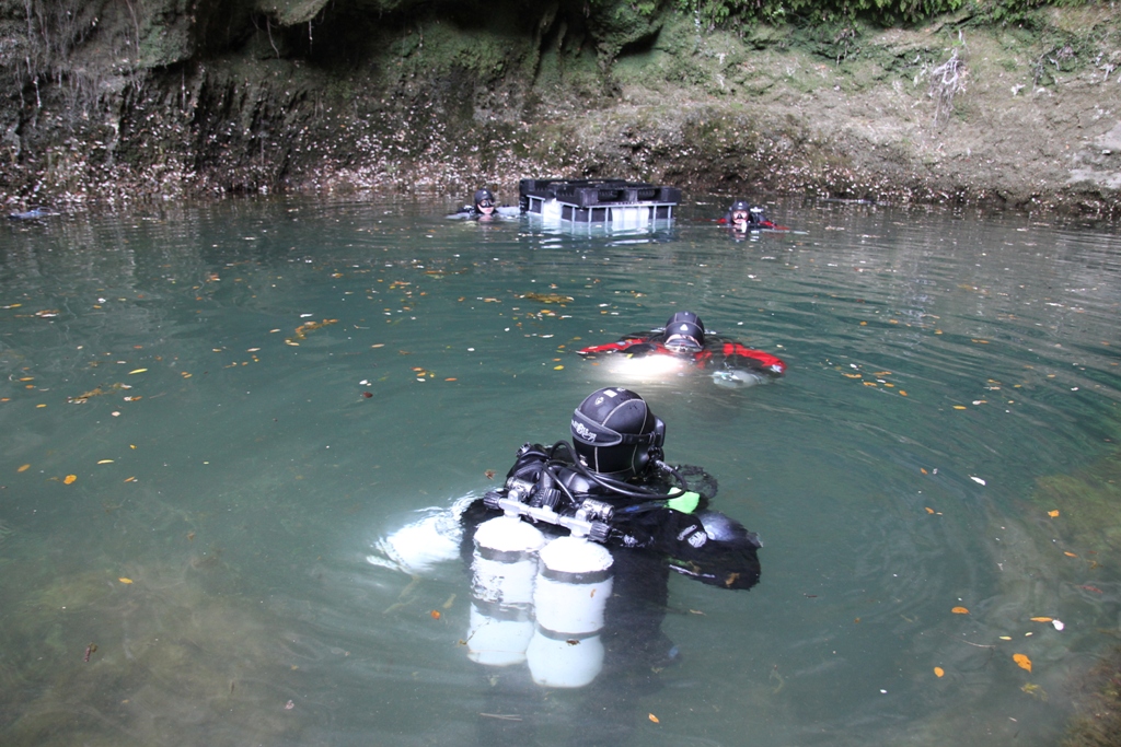 Am Ende des ersten Tauchtages waren somit alle Depots angelegt, die Leine geflickt und Marc, Andreas, Manuel und Florian konnten über die ersten Impressionen berichten. Leider wurde die Sicht im tieferen Bereich nicht besser – es waren zwar immer noch lockere 20m aber durch die enormen Dimensionen der Höhle wirkte das Wasser milchig.