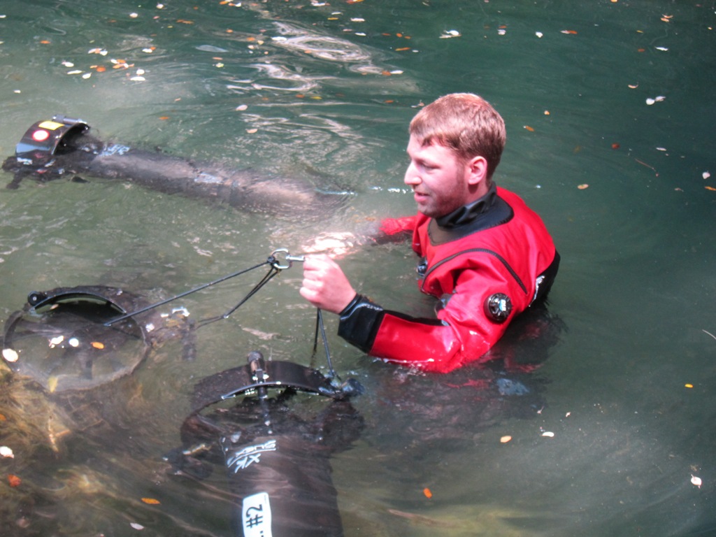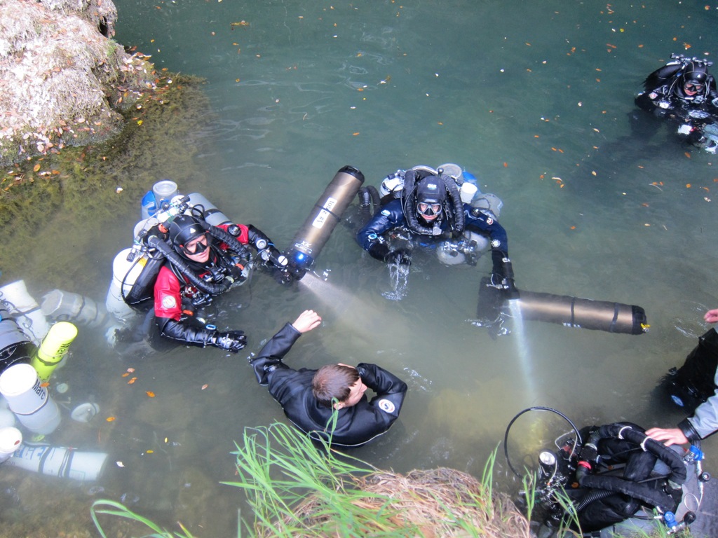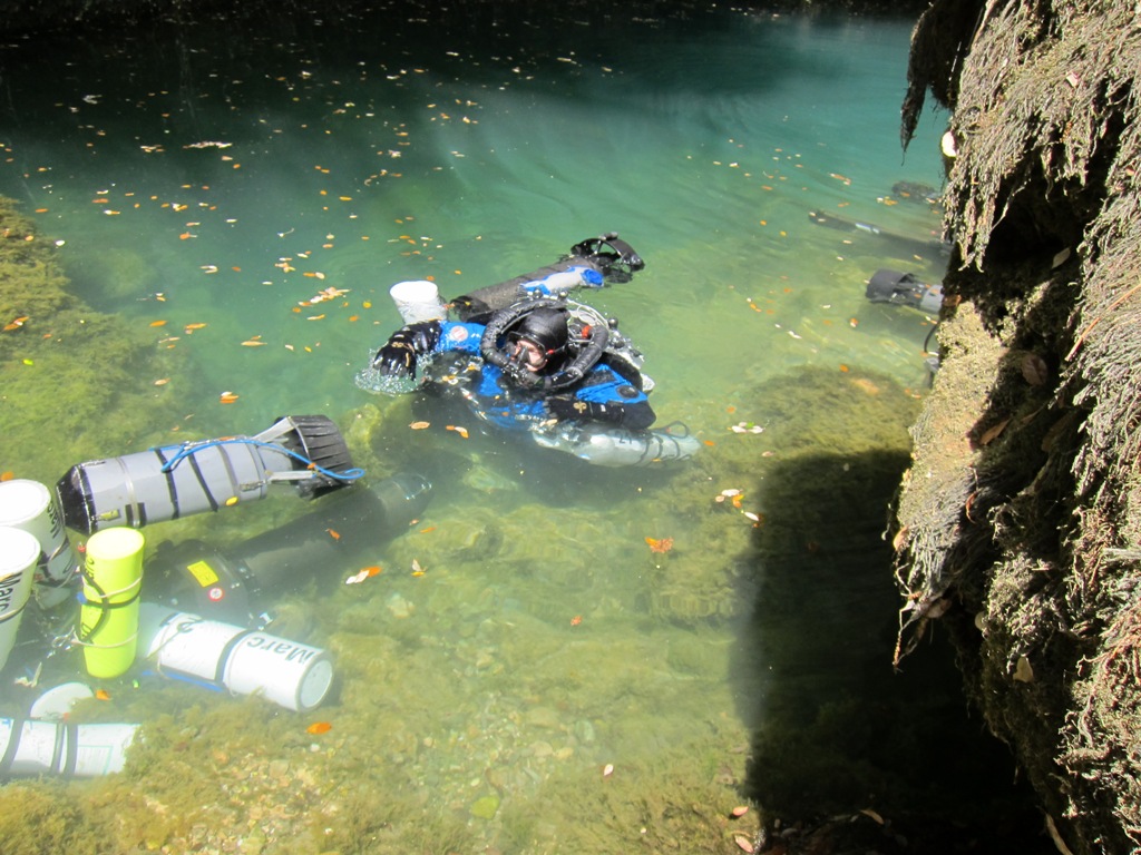 Manuel und Florian haben sich etwas versetzt zu Marc und Andreas vorbereitet, die Beiden haben ihren Tauchgang dazu genutzt die tieferen Push Depots für Stages und Scooter anzulegen. Tobias und Wilke hatten vorgeschlagen bei ca. 400m ein Depot für den Push Tag anlegen. Dieses Depot sollte zugleich als Safety Depot für alle anderen nachfolgenden Tauchgänge dienen – insbesondere für unsere OC Teams. Im Fall der Fälle waren alle Tauchpläne so optimiert, dass ein Austauchen mittels OC von jedem Punkt der Höhle aus möglich gewesen wäre. Auch Manu und Florian kamen nach gut 3 Stunden wieder aus dem Wasser.