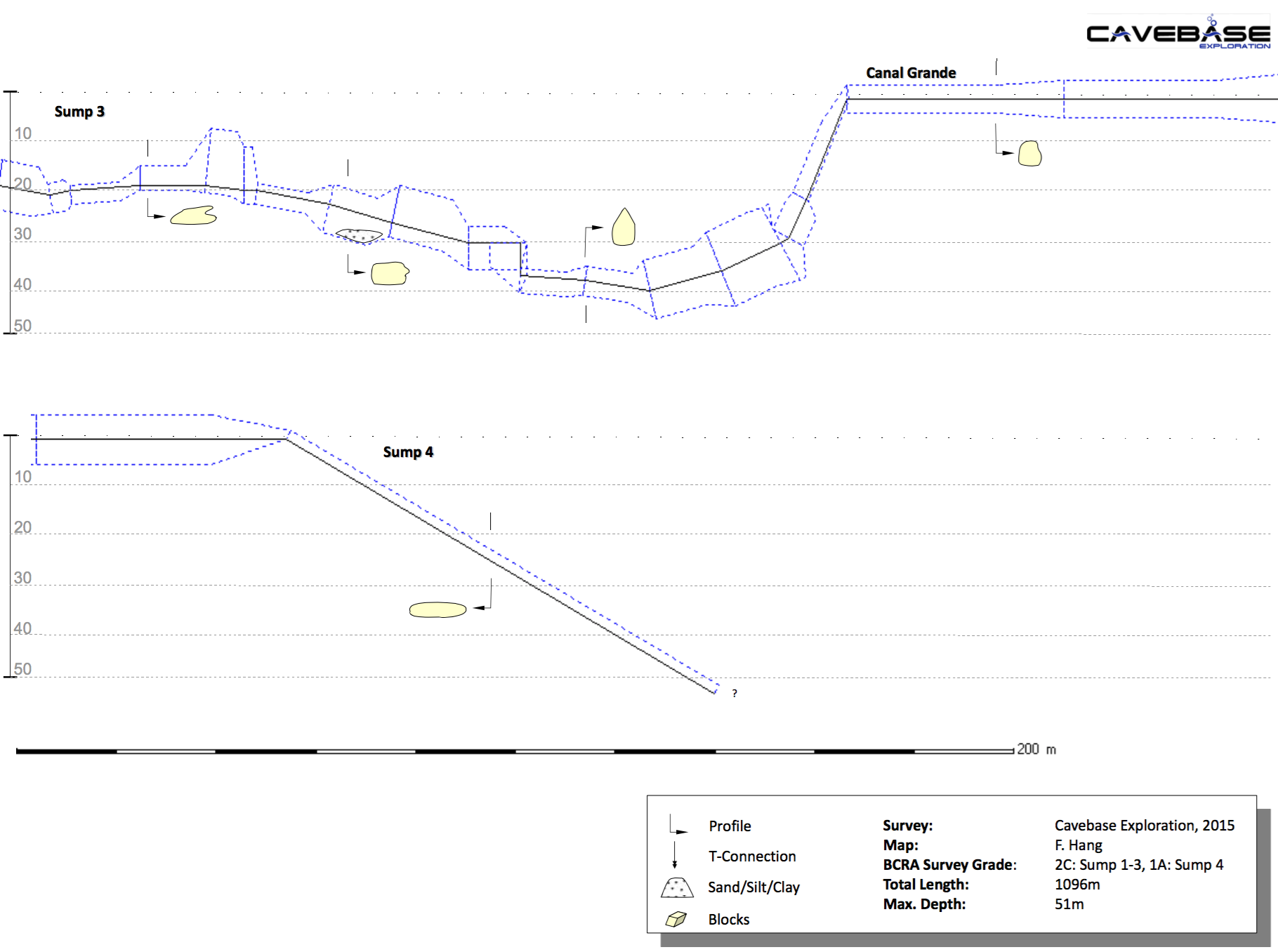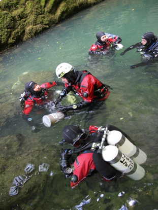 Während sich das Push-Team (diesmal mit Marc) Siphon 4 erkundete, begannen Ivo, Wilke und Heinke Messpunkte zu setzen und Tiefe, Azimut und die vier Entfernungen (Pings) zur Wand zu notieren. Anke und Ben sollten die Entfernungen zwischen den Messpunkten messen, da aber Ben beide Masken verloren hatte, ihm keine andere passte, machten sie sich auf nach Ljubljana um neue zu besorgen, so oblag es dem ersten Team dies zu tun. Leider ist Heinkes Trocki „abgesoffen“, so dass dieser Tauchgang vorzeitig beendet werden musste. Das Push-Team hat Siphon 4 nach ca. 100 Metern und maximaler Tiefe von 60m erreicht. Leider mussten Sie mit dem falschen Gas bewaffnet wieder den Rückweg antreten. Sie haben Leine repariert und neue Leine gelegt. Die zusammenhängende Gesamtlänge zu diesem Punkt beträgt gut 1000m.