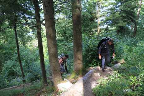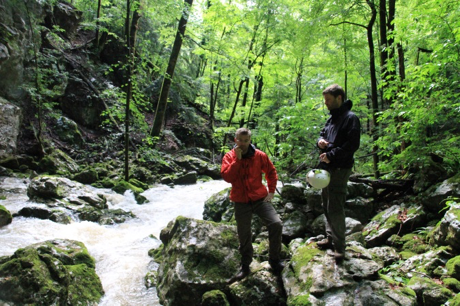 Unter Führung von Florian machten wir uns auf die Höhle zu erkunden um zu sehen mit welchen Schwierigkeiten wir beim Transport der RBs und anderer Ausrüstung zu rechnen haben, und wie wir uns einteilen müssen um die anderen Aufgaben zu erledigen. Wir hatten eine alte Zeichnung aus dem Jahr 1999, die Höhle ist inzwischen gut ausgeleint (von ungarischen Höhlentauchern, die die Höhle scheinbar regelmäßig betauchen), die Sicht war schlecht und wir entdeckten Seitengänge, die nicht in der Zeichnung dargestellt waren.