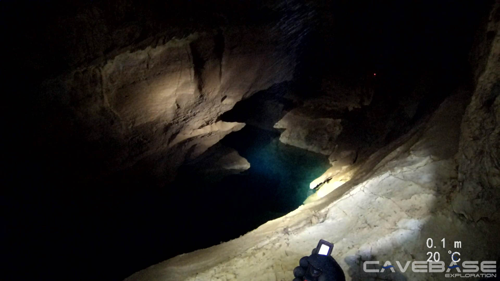 Aber die Mühe sollte belohnt werden! Wir schafften es die Felsbarriere zu überklettern und fanden einen Weg, um weiter in den Postsiphon vorzustoßen. Nach ca. 10min Klettern kamen wir an eine Kante hinter der sich der wunderschöne, sehr klare L-förmige S2 auftat. Wir schrien wie kleine Kinder: „ES GEHT WEITER!!“ Mit dieser Euphorie und noch immer großem Respekt unserer Umgebung gegenüber, bestaunten wir das klare Wasser von Sump 2.