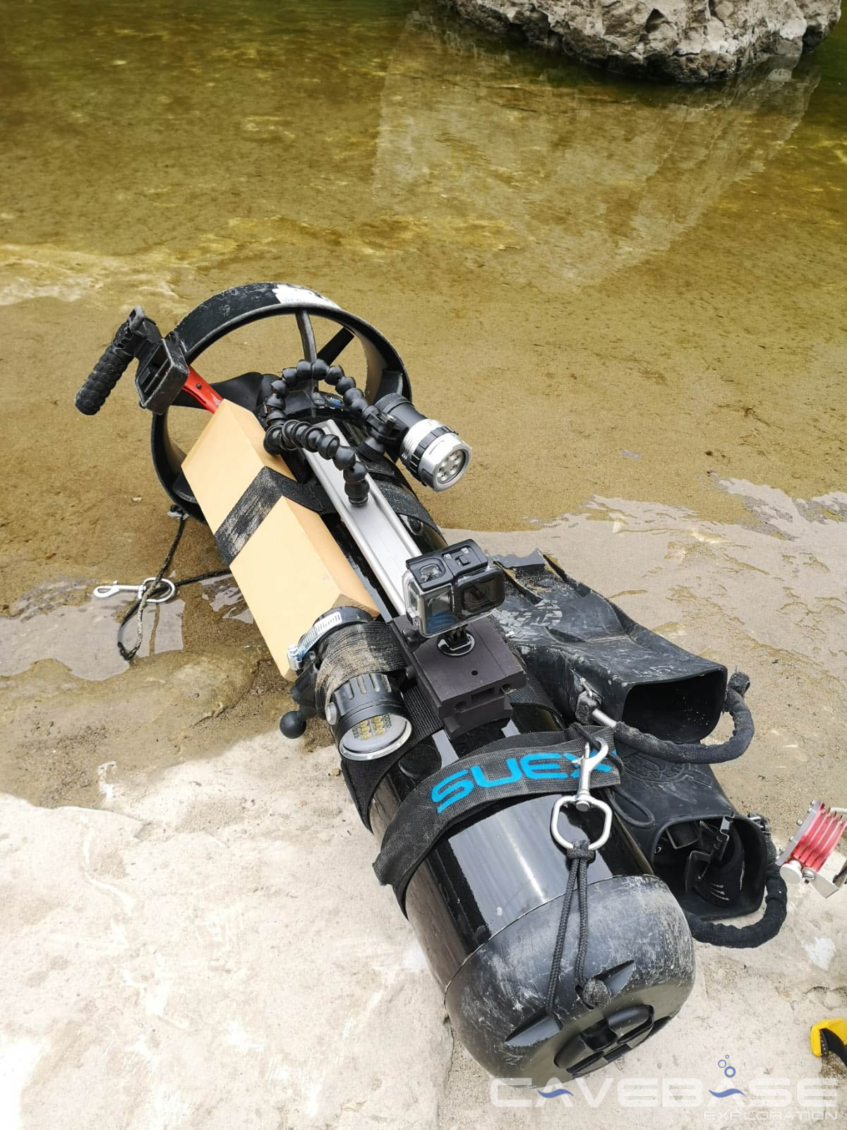 Zu Beginn des Projekts bestand das Team der Pushtaucher aus 2 Mann, Max und Fabi: Bereits beim ersten Tauchgang gelang es uns innerhalb von 70 Minuten bis zum EOL in die Salle Chaotique zu tauchen. Lediglich das Finden der Fortführung 100m nach der Schweizer Glocke hat uns etwas Zeit gekostet, da wir in dem siltigen Bereich nicht auf Anhieb die Fortführung fanden. Erst nach einigem Suchen erschloss sich uns die Fortführung, welche vom Versturz aus senkrecht nach oben ging. Mit dem Erreichen der Salle Chaotique hatten wir mit dem ersten Tauchgang des zweiten Projektes bereits die Ergebnisse des vorangegangenen Projektes in der Castor (hier lang) deutlich übertroffen. Da wir jedoch nicht die benötigte Ausrüstung für einen Ausstieg dabei hatten, beließen wie es bei einem kurzen „Guckerle“ und machten uns auf den Rückweg. Den witterungsbedingten Abbruch des letzten Projekts vor Augen, wollten wir die vorherrschenden guten Bedingungen dieses Jahr unbedingt nutzen. Auf dem Weg zurück kam es noch zu einer kritischen Situation als sich der Propeller von Max‘s Scooter in einem losen Leinenende verhedderte. Dank des Proplock am Suex XK1 konnte Max den Scooter ohne viel Zeitverlust aus der Leine lösen und den Weg aus der Höhle fortsetzen. Hier zeigt sich deutlich, dass eine schlechte Leinenführung in der Höhle ein Sicherheitsrisiko darstellt. Das Team hatte im ersten Projekt angefangen das Leinenchaos in der Castor zu beheben, mussten sich aber im Anschluss an das Projekt rechtfertigen, weil wir (lose) Leine aus der Höhle entfernt hatten und damit Vermessungsarbeit anderer Taucher zerstört hätten. Deswegen mussten wir zum Erhalt der Tauchgenehmigung versprechen die Leinensituation so zu belassen wie wir sie vorfinden. Hier muss man sich schon fragen, ob das Leinenchaos, das sicher keinem mehr als Vermessungsleine dient, das Sicherheitsrisiko wert ist. Vor allem da es nicht das letzte Mal sein sollte, dass ein Teammitglied sich in losen Leinen verhedderte…
