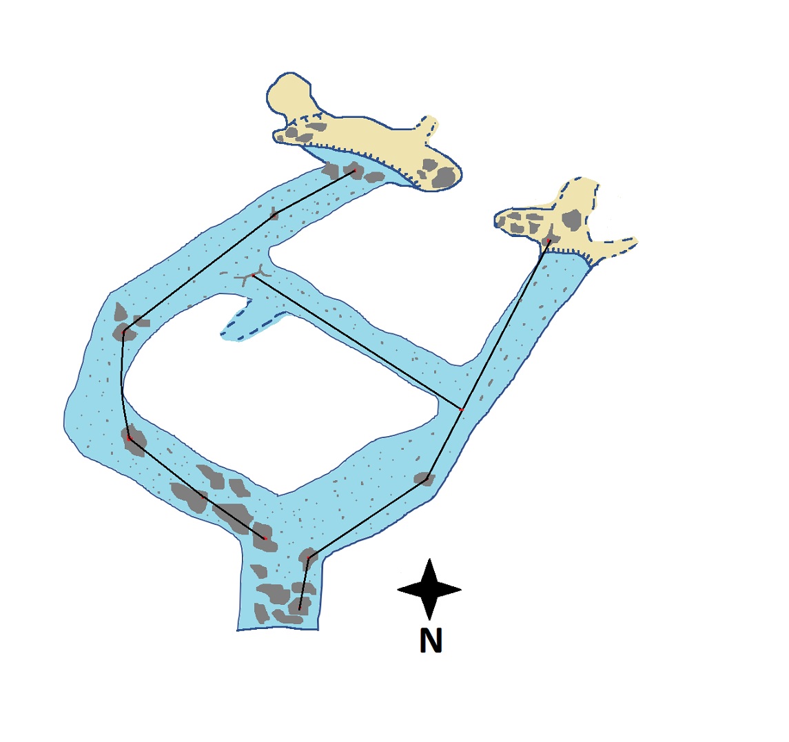 Verlauf des Donut Sumps inkl. der verlegten Leine. Im Norden die beiden neuen Auftauchstellen