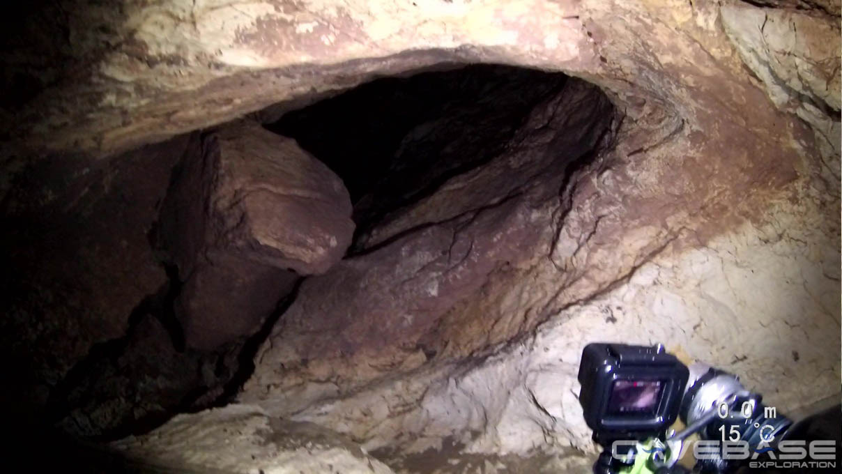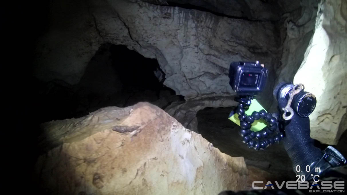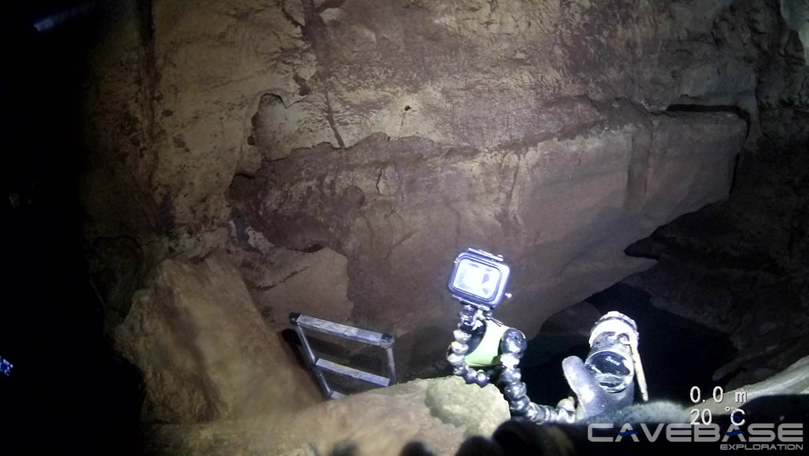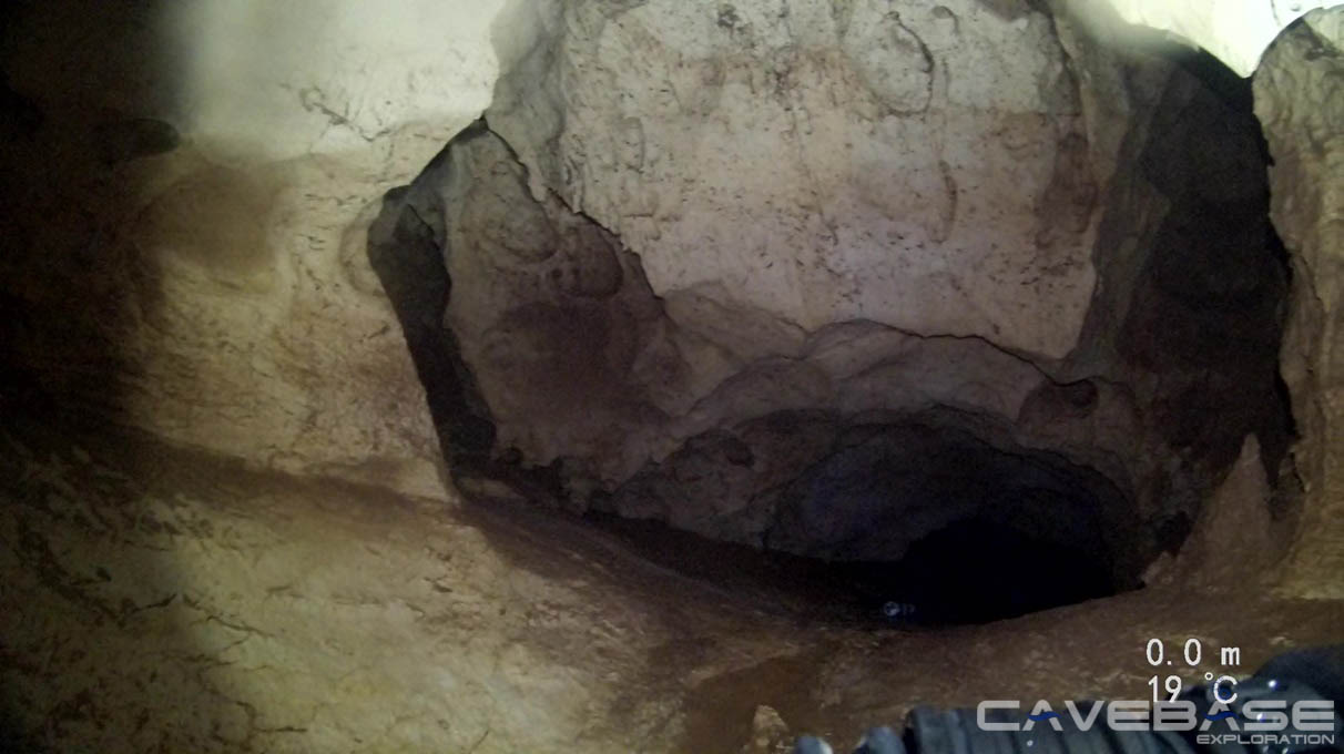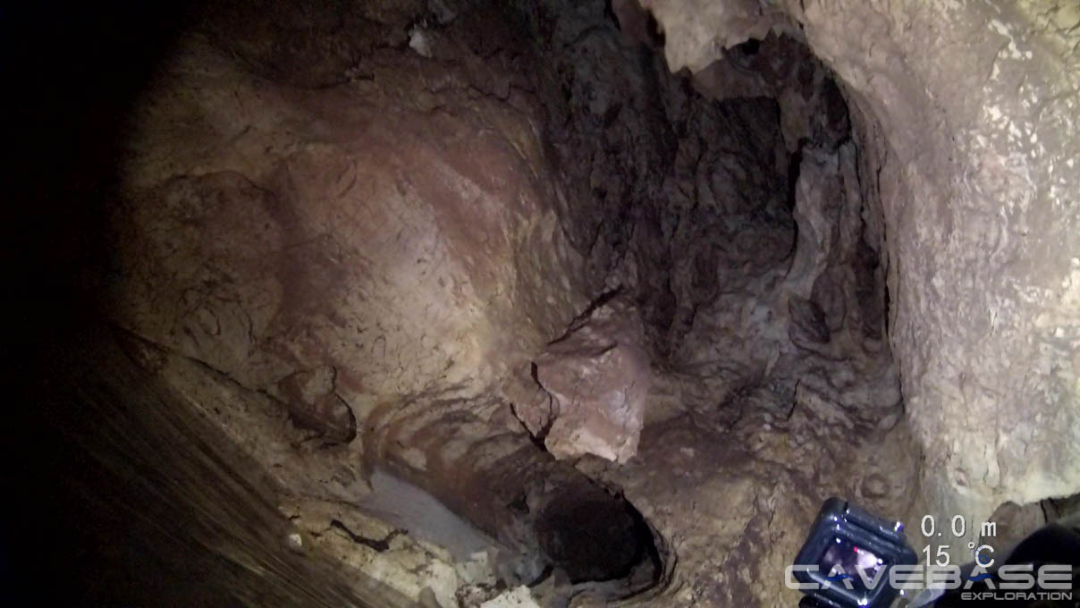 Der Ausstieg Süd-Ost vom Donut Sump hat etwas steileres Ufer mit nur einem sehr kurzen ebenen Trockenbereich. Hier gibt es 2 „Löcher“, die es mit deutlich leichterer Ausrüstung genauer zu erkunden gilt. Um hier weiter zu kommen, wäre wieder eine schlanke OC Schleifsack Kombination nötig, um entsprechend sicher über die Felsen klettern zu können.