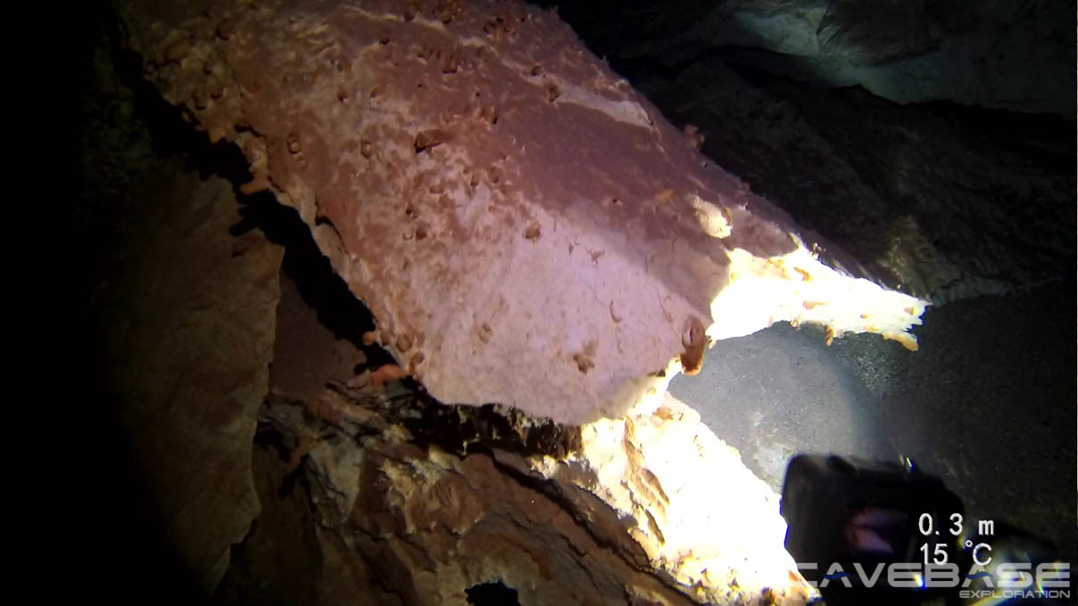 Wenn man sich jetzt Richtung S2 umdreht, wirkt es als ob über dem Pool ein großer Felsen hängt. Durch die seitliche Auswaschung des Ganges hat die flachere Decke darüber eine runde Form. Bei der Erkundung beider Trockenbereiche jenseits S2 war sehr gut ein Wasserrauschen aus Süden zu hören, jedoch war keinerlei Strömung oder Wasserlauf im Donut Sump selber zu vernehmen.