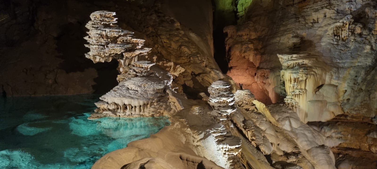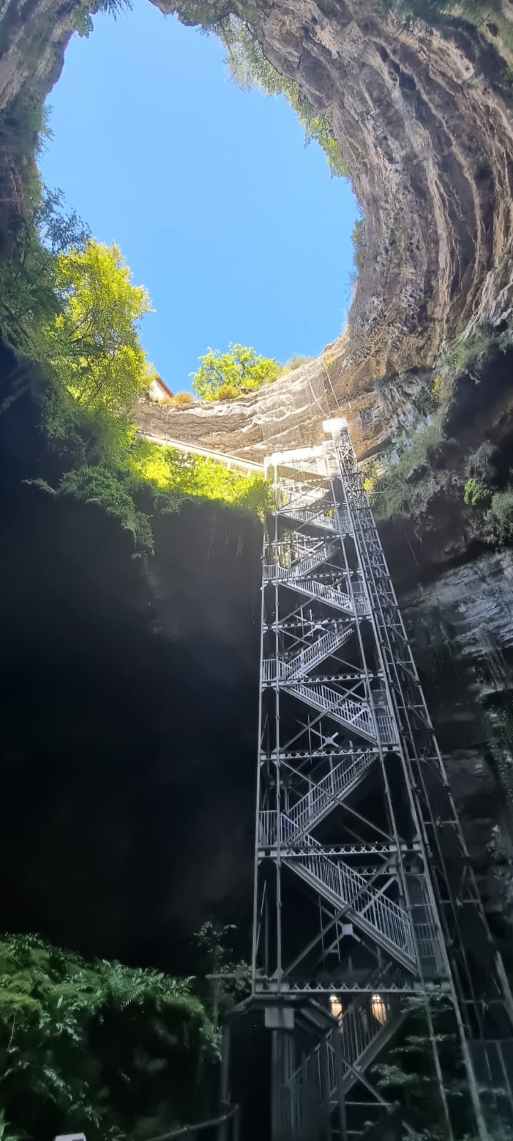 SteffenB wollte den Tauchgang ausfallen lassen, um seinem lädierten Kreuzband einen Tag Pause zu gönnen. Daher machte er sich mit SteffenK und Sprössling Sascha auf zur Show-Höhle Padirac, nachdem die Mannschaft in der St. George abgetaucht war. Für 19,50€ pro Person durften wir die 100m über einen Treppenschacht und in das trockene Höhlensystem einsteigen. Beeindruckend dort unten zu stehen und nach oben zu blicken. Der Schacht – ein typisches Sinkhole – hat einen Durchmesser von ~50m und ist ~100m tief. An dieser Stelle kamen uns Bilder aus unserem Projekt 2020 – Kefalonia (Griechenland) in den Kopf. Damals mussten wir uns 70m in einem solchen Schacht abseilen. Wie erfreut wir doch waren diesmal einen Aufzug für den Weg nach oben nutzen zu dürfen – was dem Kreuzband auch ganz Recht war.