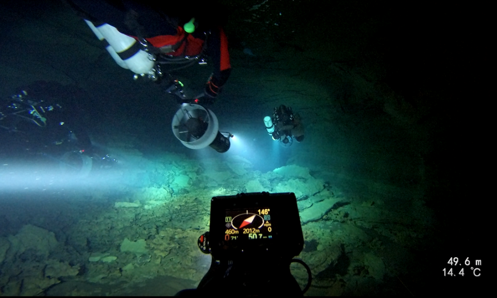 – Mats, Marcel, Zeljka, SteffenB planten zum Schacht auf 80m zu tauchen, dort kehrt zu machen und den Deep-Loop zu vervollständigen. Leider fiel Zeljka mit einem Manschettenriss aus. (Danke an Olivier von „The cave to be“, er tauschte die Manschette über Nacht, so war Zeljka am nächsten Tag wieder tauchklar).